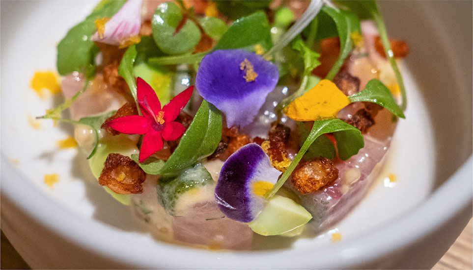 料理は出会った食材からひらめくことが多いとおっしゃる春田シェフが作り上げるエディブルフラワーを纏ったメニューは美しく繊細で、手をつけるのがためらわれるほど。このエディブルフラワーは、「花も食べ物の一つ。それぞれに味の個性も、旬もある。」と、花の可能性を探求している花屋さんにシェフが出会ったことがきっかけ。春田シェフの考える〝いかに美しく、美味しく、思慮深いか〟を提供するモダンフレンチのあり方に合致した、大切な食材だったのです。ただの演出にとどまらず、選び抜く食材には、どれにもサステナビリティ(持続可能性)の観点が宿っています。