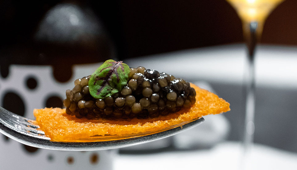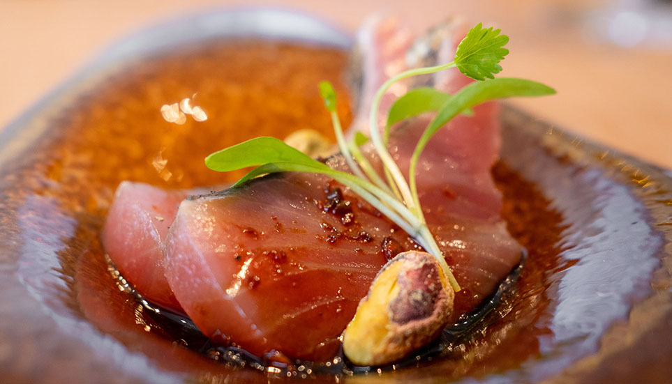 隠れ家のような目立たない外観から、ひとたび階段を降りると、そこには黒を基調としたスタイリッシュな大人の空間が広がり、食事の舞台となるオープンキッチンのカウンター席、1日1組限定の個室席へと導かれます。そこで繰り広げられるライブ感あふれるパフォーマンスと、季節の美味しい瞬間を五感で味わう独創的な肉料理の数々にはみなさん驚かれることでしょう。